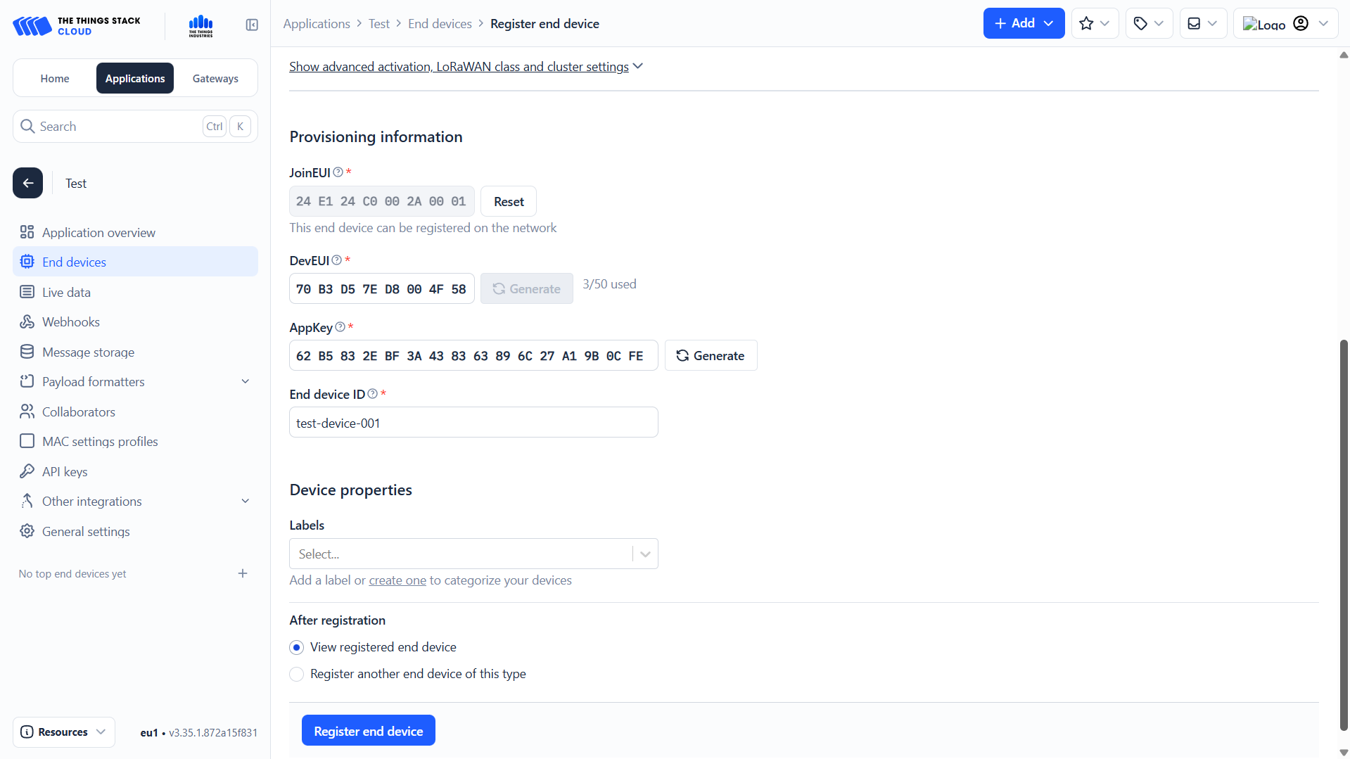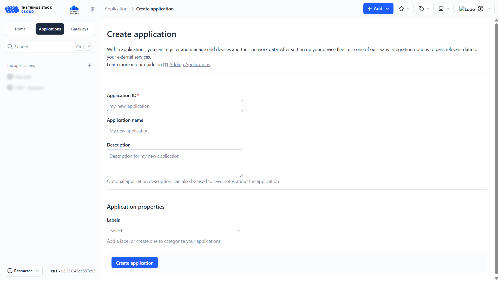 - (Optional) Label — It is recommended to use the same label for the application, end devices, and gateways.