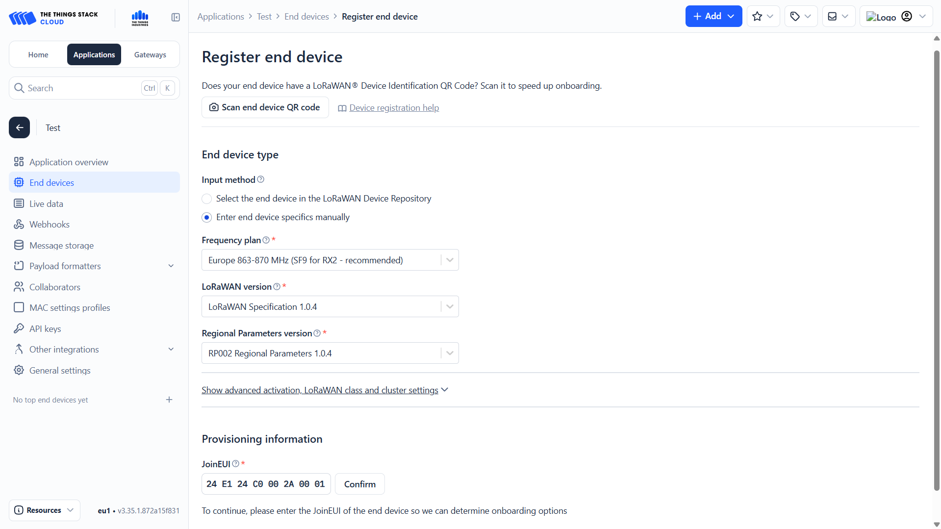 This method is used when the device is not available in the LoRaWAN Device Repository or when full manual control over device parameters is required.