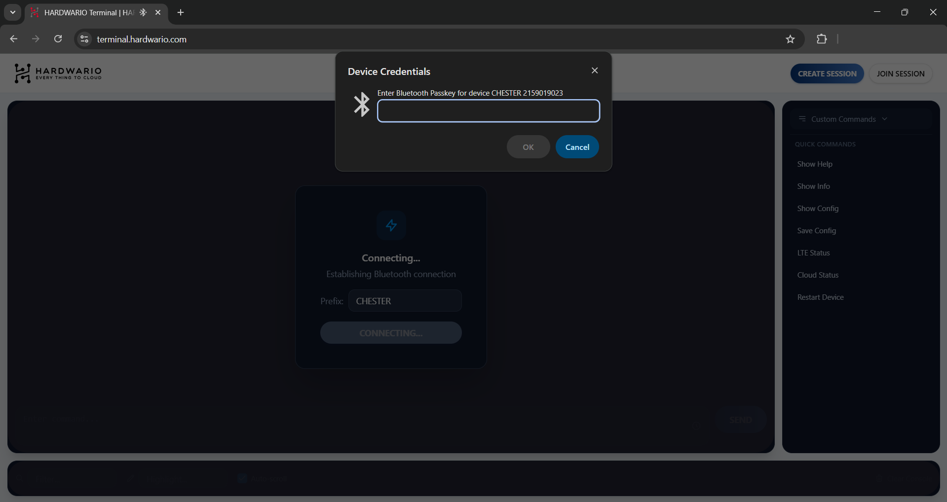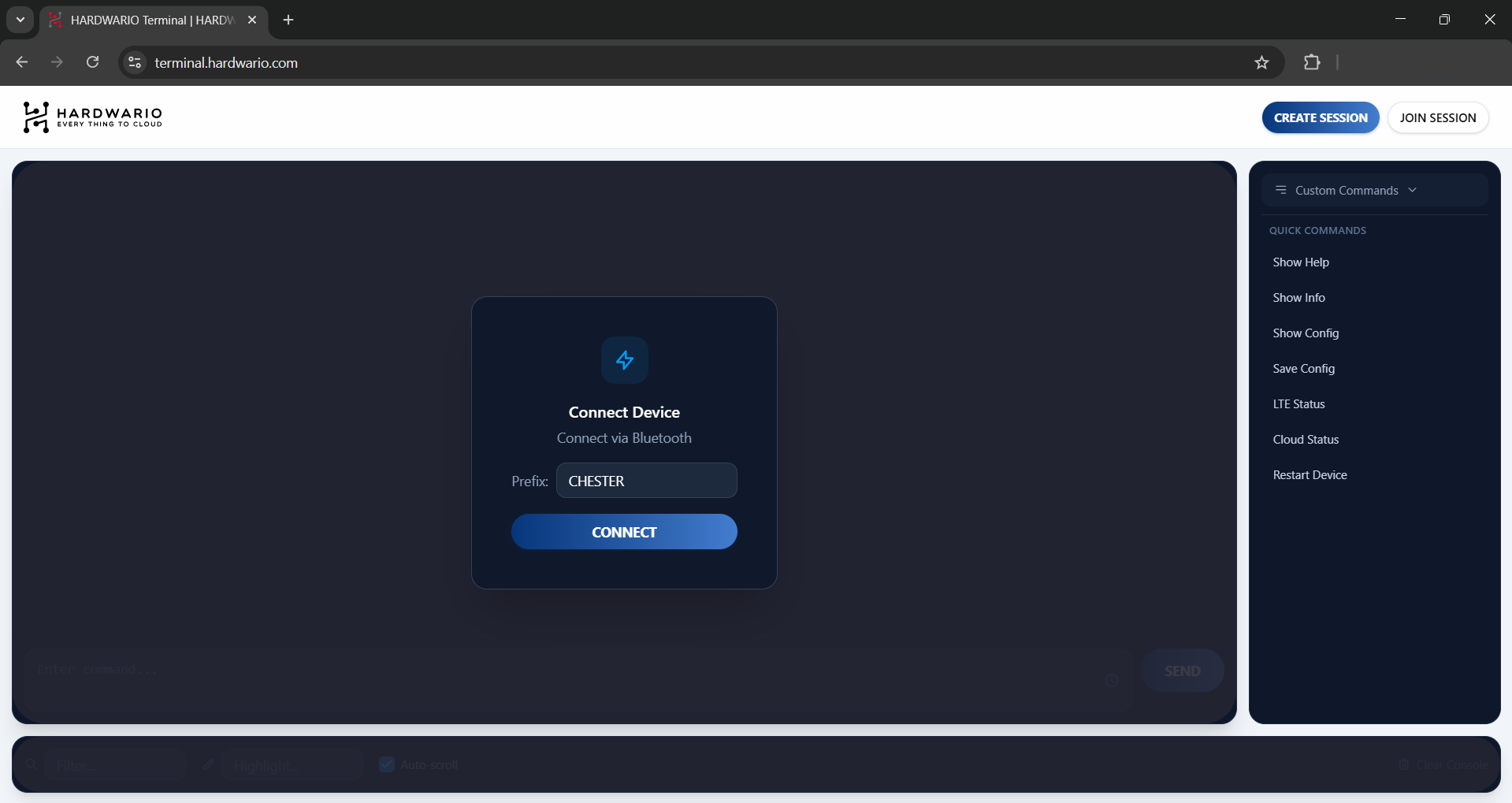 A major advantage of the HARDWARIO Terminal App is the Remote Session feature. This allows you to grant access to your device to someone far away (such as HARDWARIO Support) without them needing a direct Bluetooth connection. Only you need to be physically connected via Bluetooth; you can then share a Session ID to let them control the CHESTER remotely.